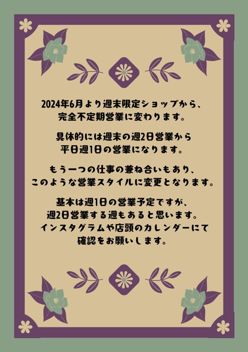 営業日に関しては店頭カレンダーもしくはInstagramで告知予定になります。